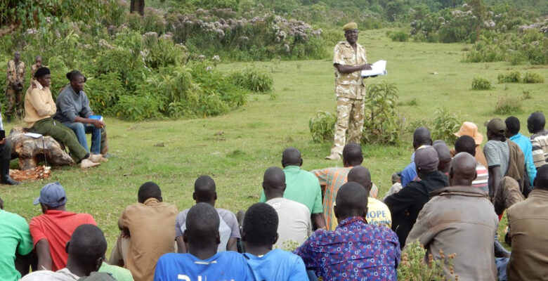 Banner: Chepnyalil Cave, Mount Elgon National Park, Kenya. Above: top left – members of the team deep in the Forest Reserve, Kenya; top right – community meeting led by Kenya Wildlife Service. Above group photo: Mount Elgon Foundation, MEEP, Kenya Wildlife Service, East African Wild Life Society and Elephant Crisis Fund personnel at a SMART training day, Mount Elgon National Park, Kenya. (Credits: Christopher Powles and MEEP.)