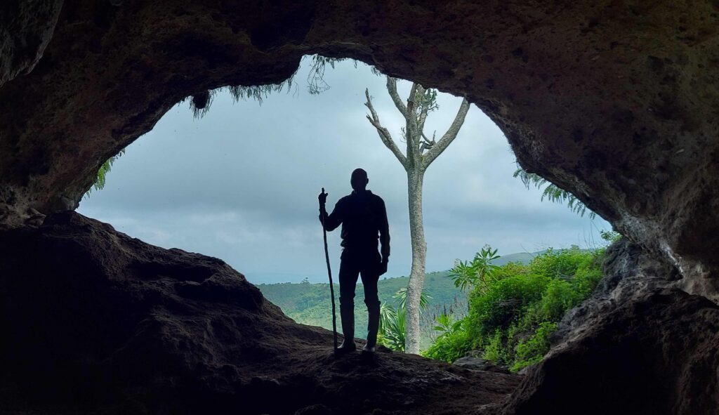 One of the many remote caves the elephants mine, with an East African Wild Life Society – Mount Elgon Elephant Project scout. Photo credit: Mount Elgon Foundation.