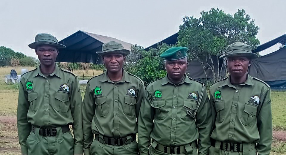 Four East African Wild Life Society – Mount Elgon Elephant Project (MEEP) Scouts during training in the Masai Mara with the Mara Elephant Project. Photo Credit: MEEP.