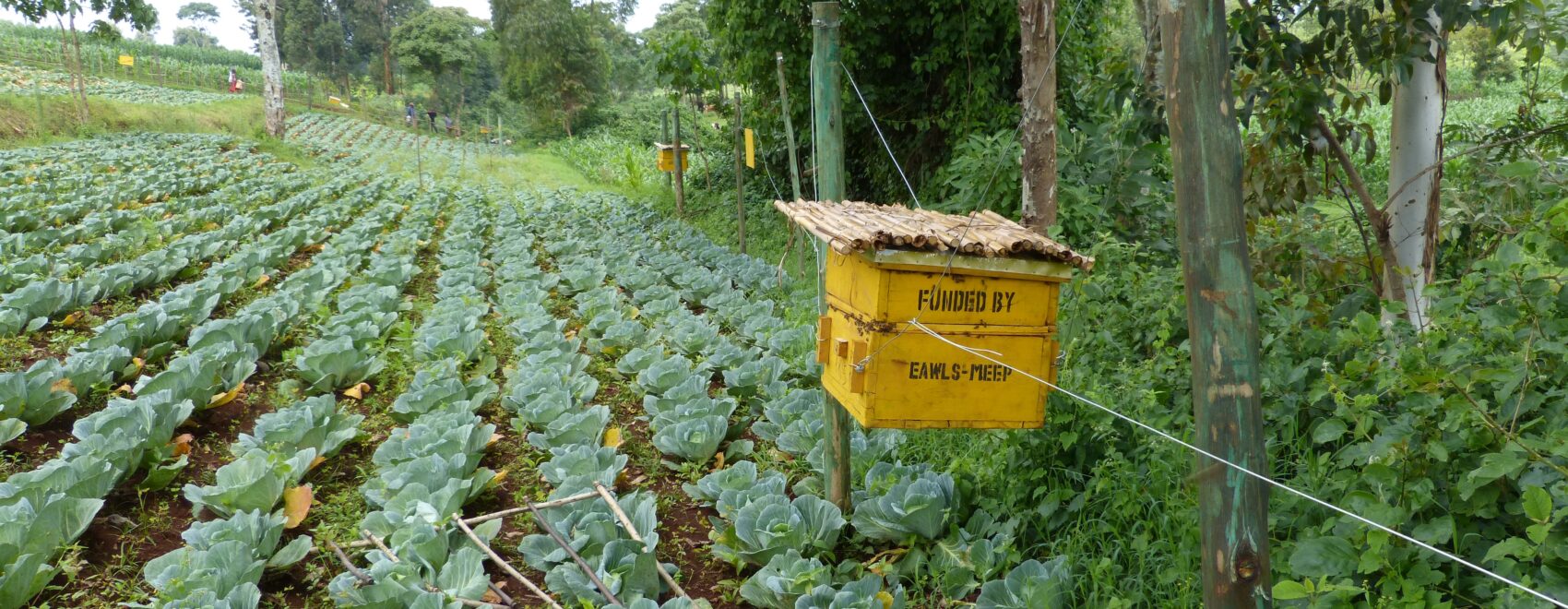 Banner: a beehive fence protecting a field of cabbages. Above: top left – a beehive in one of the first fences on Mount Elgon; top right – a catcher box placed in a tree to catch passing swarms; bottom left -moving one of the poles into position; bottom right – the 5 farmers selected for the pilot in their bee suits. (Credits: EAWLS-MEEP.)