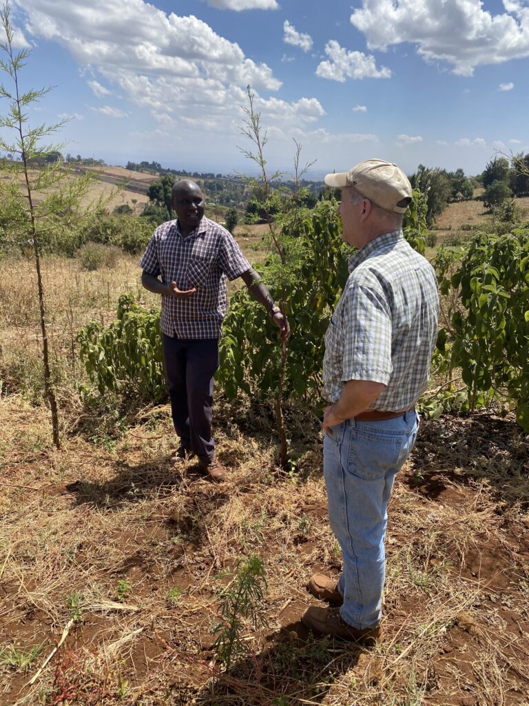 Above left: a farmer’s wife with a recently planted Grevillia seedling; above middle: cultivation right down to the Rongai river that needs replanting by the river with indigenous seedlings; above right: the founder of this project, Philip Chepso, addressing his programme partner, Dan Van Lehman. (Credit: Sophie Milton.)