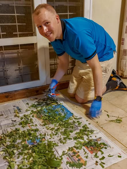 A team wishing to research into elephant self-medication from the Bernhard Nocht Institute for Tropical Medicine in Hamburg, Germany has been on Mt Elgon, supported by the Mount Elgon Foundation and National Museums of Kenya (NMK). They have yet to obtain research permission so this visit was orientation i.e. to meet key people, to see the research site and to progress their applications to do research. With NMK, they collected medical plant samples which they had to cut up and dry before leaving them at the herbarium at Nairobi Museum. Here is Dr Fabien Schultz, the team leader, doing just that.